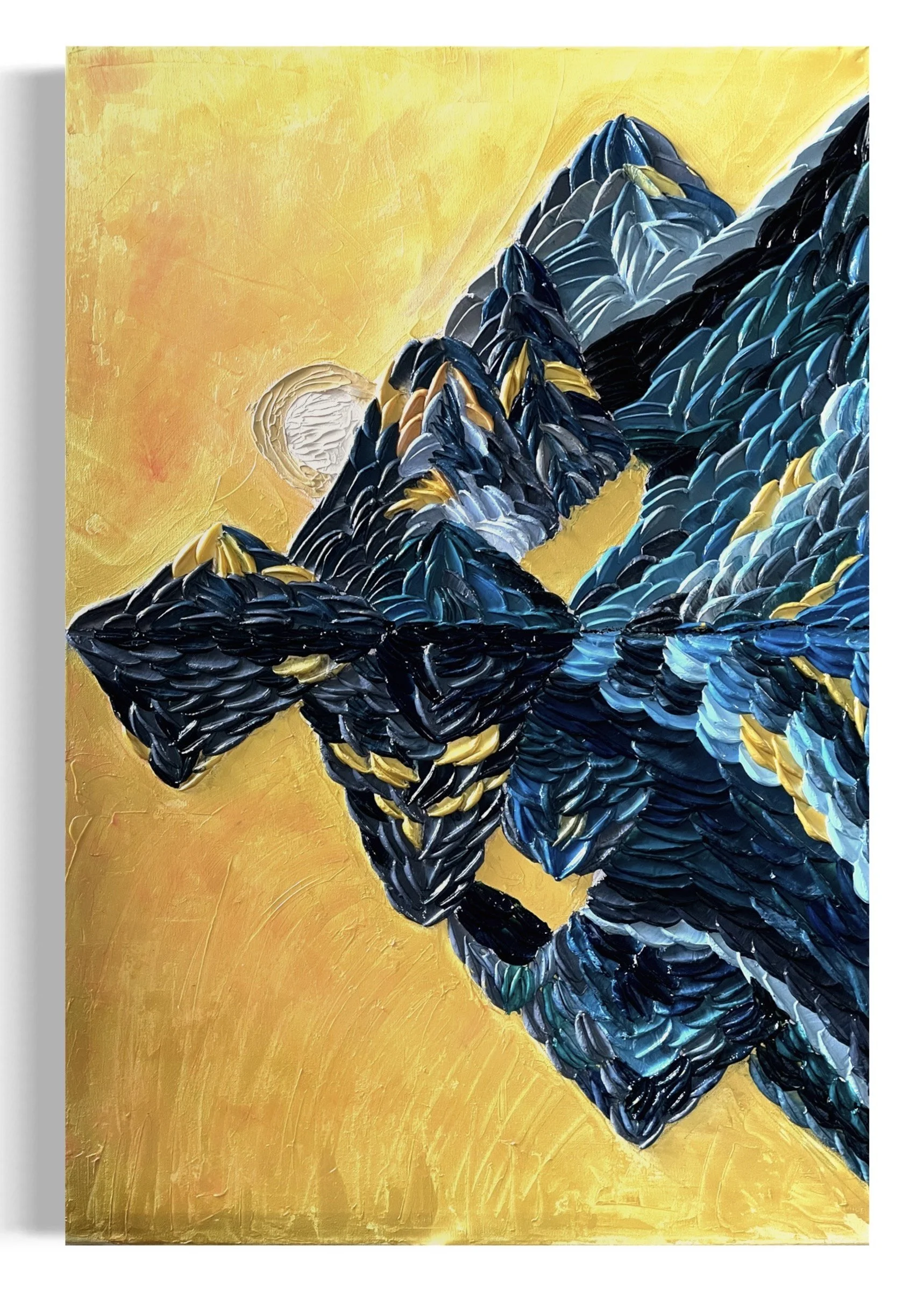 The golden peaks of yonder invite you from the deep blue slumber of the fast fearing night. This painting is a textured acrylic on canvas and belongs to the theme 'Soliloquy'. Soliloquy seeks to induce a deep inner dialogue through memories evoked of shared experiences.
